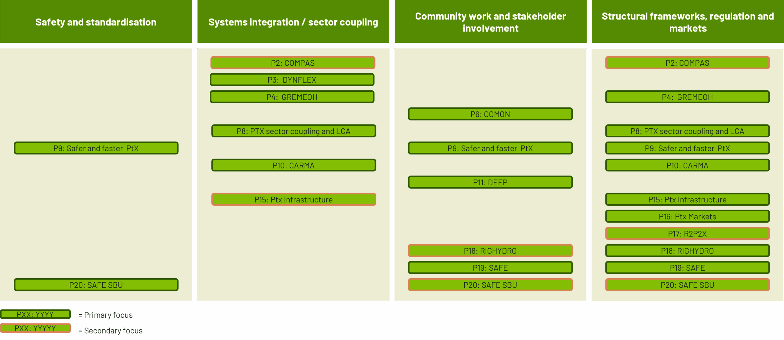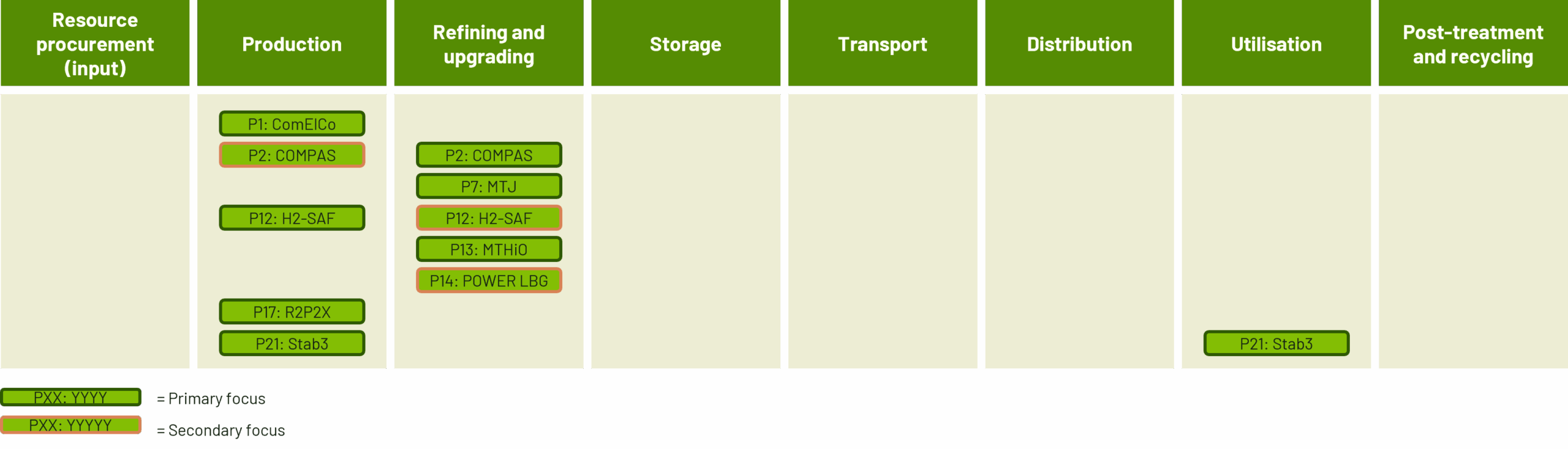 Below you can see a mapping of the first 21 portfolio projects. They are mapped on the value chain for green fuels and in regards to cross-cutting themes: Societal and systemic. The overview will be updated when our Pool 2.5 and 3 projects are qualified.